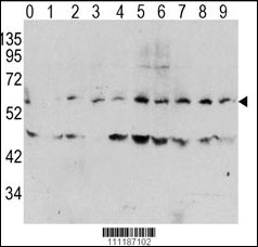 Western blot analysis of Phospho-MYC-T58 Antibody in human TPA activated Hela cell line lysates. Phospho-MYC (arrow) was detected using the purified PAb. (0: without TPA; 1: 60ug/ml TPA, 15min; 2: 60ug/ml TPA, 30min; 3: 60ug/ml TPA, 45min; 4: 125ug/ml TPA, 15min; 5: 125ug/ml TPA, 30min; 6: 125ug/ml TPA, 45min; 7: 250ug/ml TPA, 15min; 8: 250ug/ml TPA, 30min; 9: 250ug/ml, 45min) |