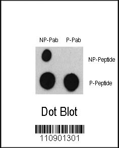 Dot blot analysis of Phospho-ATF2-S322 Antibody (Cat. APR05176G) and ATF2 Non Phospho-specific Pab on nitrocellulose membrane. 50ng of Phospho-peptide or Non Phospho-peptide per dot were adsorbed. Antibody working concentrations are 0.5ug per ml. |