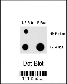 Dot blot analysis of Phospho-EGFR-Y998 Antibody (Cat. APR05179G) and EGFR Non Phospho-specific Pab on nitrocellulose membrane. 50ng of Phospho-peptide or Non Phospho-peptide per dot were adsorbed. Antibody working concentrations are 0.5ug per ml.