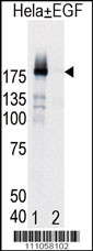 Western blot analysis of EGFR (arrow) in Hela cell lysates, either induced (Lane 1) or noninduced with EGF (Lane 2). |