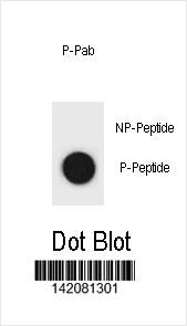 Dot blot analysis of Mouse CCNB2 Antibody (Phospho S392) Phospho-specific Pab (Cat. APR05328G) on nitrocellulose membrane. 50ng of Phospho-peptide or Non Phospho-peptide per dot were adsorbed. Antibody working concentrations are 0.6ug per ml. |