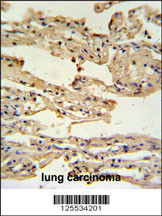 IFM2 Antibody (N-term) (Cat. APR05352G) IHC analysis in formalin fixed and paraffin embedded lung carcinoma followed by peroxidase conjugation of the secondary antibody and DAB staining. This data demonstrates the use of the IFM2 Antibody (N-term) for immunohistochemistry. Clinical relevance has not been evaluated. |