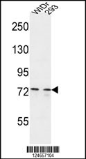 CEP63 Antibody (Center) (Cat. APR05355G) western blot analysis in WiDr,293 cell line lysates (35ug/lane).This demonstrates the CEP63 antibody detected the CEP63 protein (arrow).
