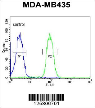 CC50B Antibody (N-term) (Cat. APR05364G) flow cytometric analysis of MDA-MB435 cells (right histogram) compared to a negative control cell (left histogram).FITC-conjugated goat-anti-rabbit secondary antibodies were used for the analysis. |