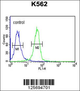 EFR3A Antibody (C-term) (Cat. APR05366G) flow cytometric analysis of K562 cells (right histogram) compared to a negative control cell (left histogram).FITC-conjugated goat-anti-rabbit secondary antibodies were used for the analysis. |