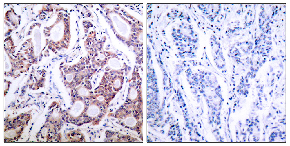 Immunohistochemistry analysis of paraffin-embedded human breast carcinoma tissue, using NF-kappaB p100 (Ab-869) Antibody. |