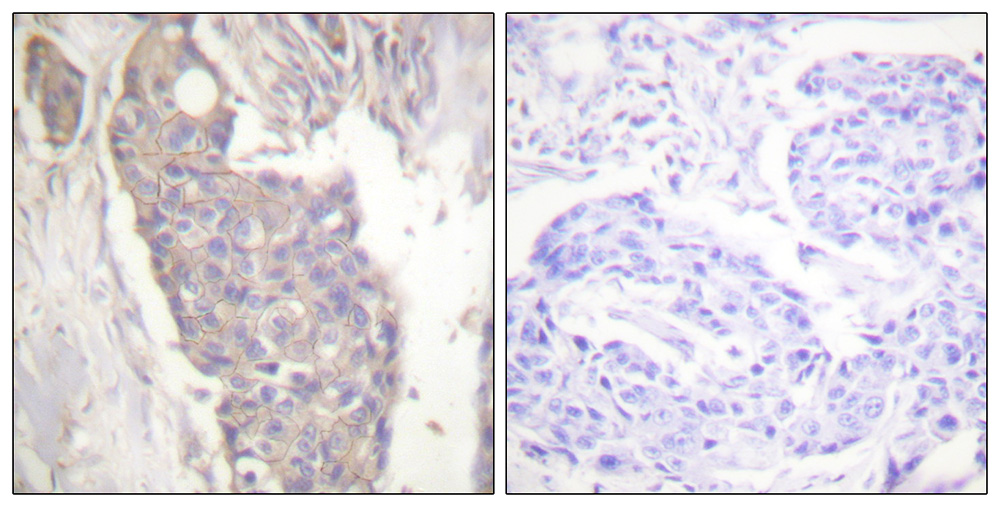 Immunohistochemistry analysis of paraffin-embedded human breast carcinoma tissue using Fas antibody. |
