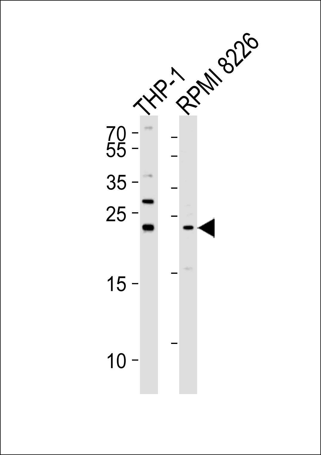 Western blot analysis of lysates from THP-1,RPMI 8226 cell line (from left to right),using Bak Antibody(C0131). C0131 was diluted at 1:1000 at each lane. A goat anti-rabbit IgG H&L(HRP) at 1:5000 dilution was used as the secondary antibody.Lysates at 35ug per lane.