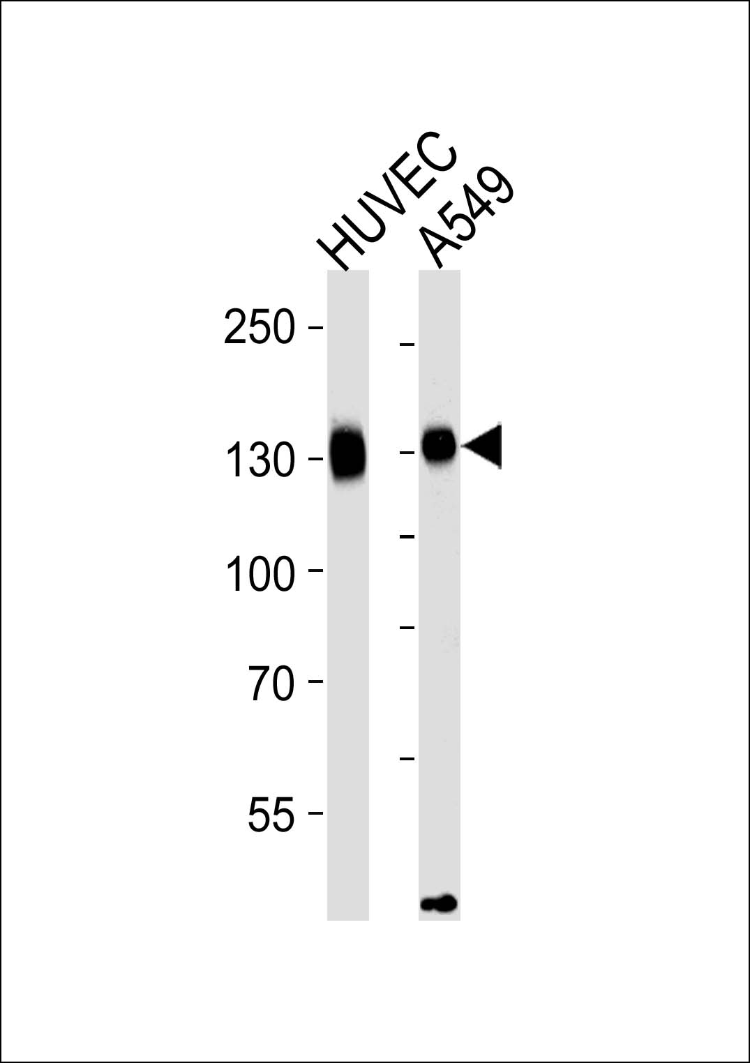 Western blot analysis of lysates from HUVEC,A549 cell line (from left to right),using ITGAV (heavy chain, Cleaved-Lys889) Antibody(L0297). L0297 was diluted at 1:1000 at each lane. A goat anti-rabbit IgG H&L(HRP) at 1:5000 dilution was used as the secondary antibody.Lysates at 35ug per lane. |