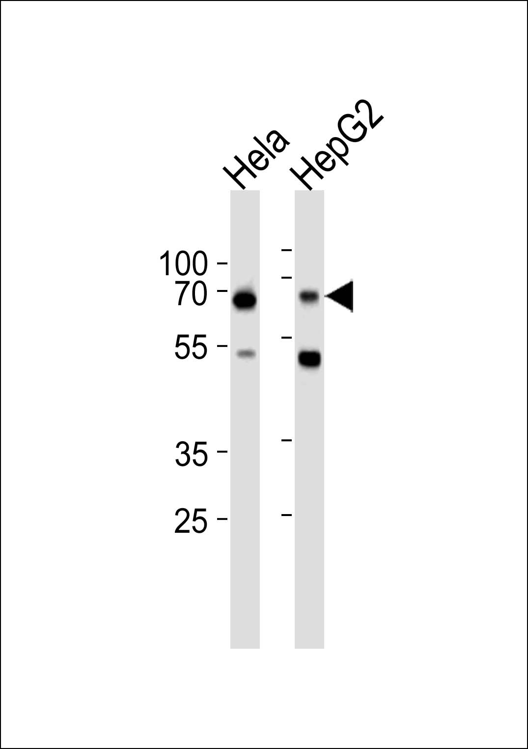 Western blot analysis of lysates from Hela,HepG2 cell line (from left to right),using HEXIM1 Antibody(C10210). C10210 was diluted at 1:1000 at each lane. A goat anti-rabbit IgG H&L(HRP) at 1:5000 dilution was used as the secondary antibody.Lysates at 35ug per lane.