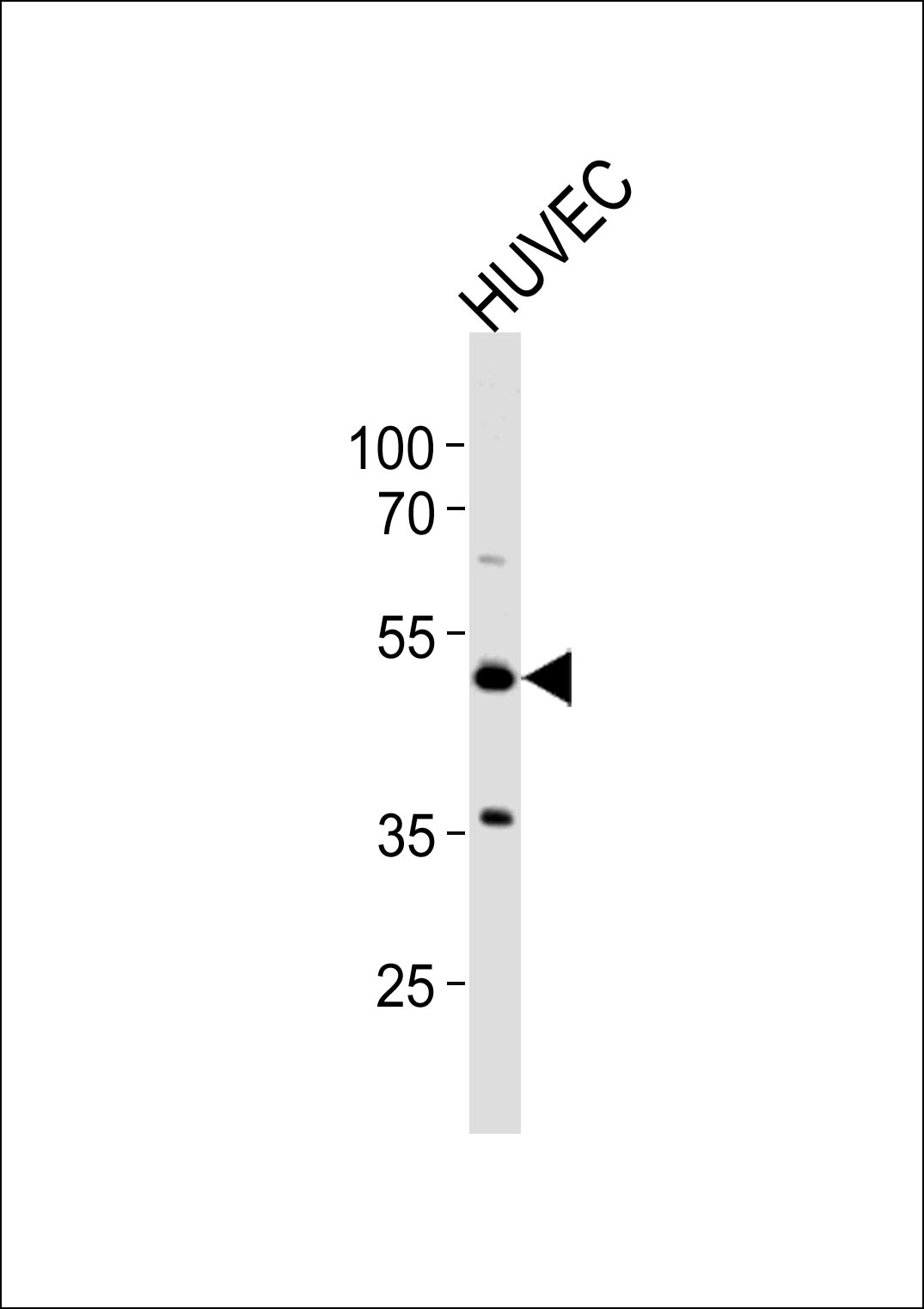 Western blot analysis of lysates from HUVEC cell line ,using Prostacyclin Receptor Antibody(G725). G725 was diluted at 1:1000. A goat anti-rabbit IgG H&L(HRP) at 1:5000 dilution was used as the secondary antibody.Lysates at 35ug.