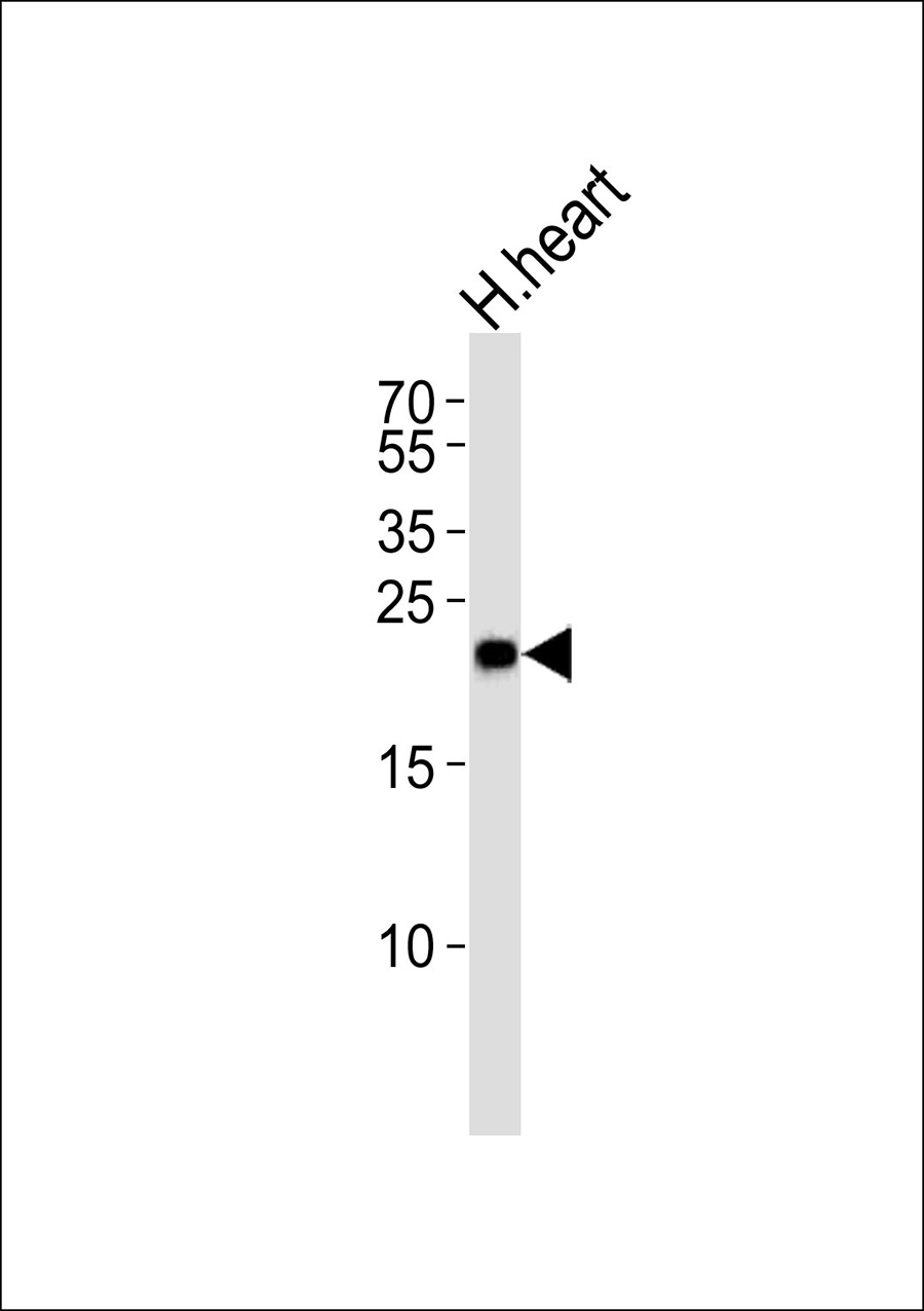 Western blot analysis of lysate from human heart tissue lysate,using FGF13 Antibody(APR05426G). APR05426G was diluted at 1:1000. A goat anti-rabbit IgG H&L(HRP) at 1:5000 dilution was used as the secondary antibody.Lysate at 35ug. |