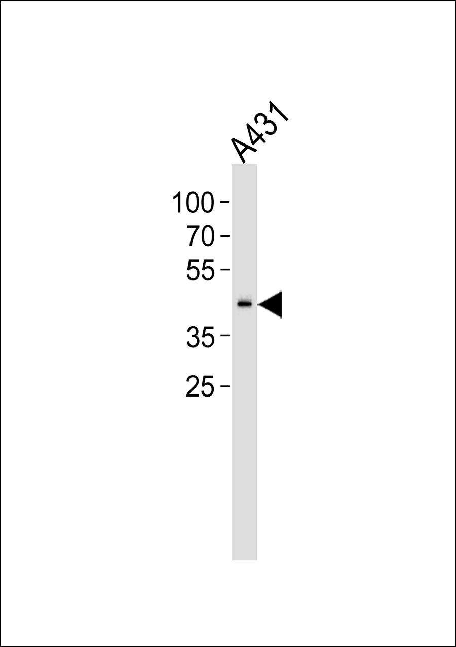 Western blot analysis of lysate from A431 cell line,using MMP-23 Antibody(APR05443G). APR05443G was diluted at 1:1000. A goat anti-rabbit IgG H&L(HRP) at 1:5000 dilution was used as the secondary antibody.Lysate at 35ug. |