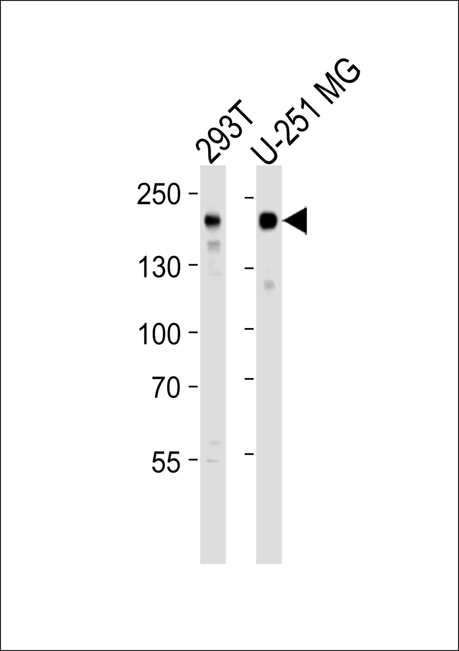 Western blot analysis of lysates from 293T,U-251 MG cell line (from left to right),using KIF4A Antibody(APR05446G). APR05446G was diluted at 1:1000 at each lane. A goat anti-rabbit IgG H&L(HRP) at 1:5000 dilution was used as the secondary antibody.Lysates at 35ug per lane. |