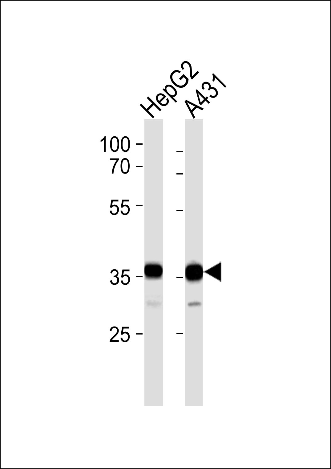 Western blot analysis of lysates from HepG2,A431 cell line (from left to right),using TFDP2 Antibody was diluted at 1:1000 at each lane. A goat anti-rabbit IgG H&L(HRP) at 1:5000 dilution was used as the secondary antibody.Lysates at 35ug per lane. |