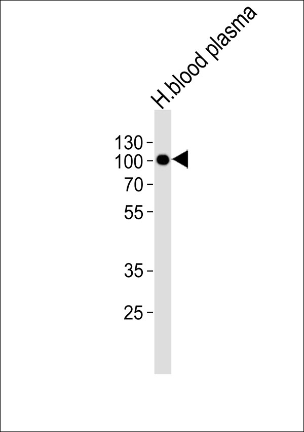 Western blot analysis of lysate from human blood plasma tissue lysate,using SERPING1 Antibody, was diluted at 1:1000. A goat anti-rabbit IgG H&L(HRP) at 1:5000 dilution was used as the secondary antibody.Lysate at 35ug.