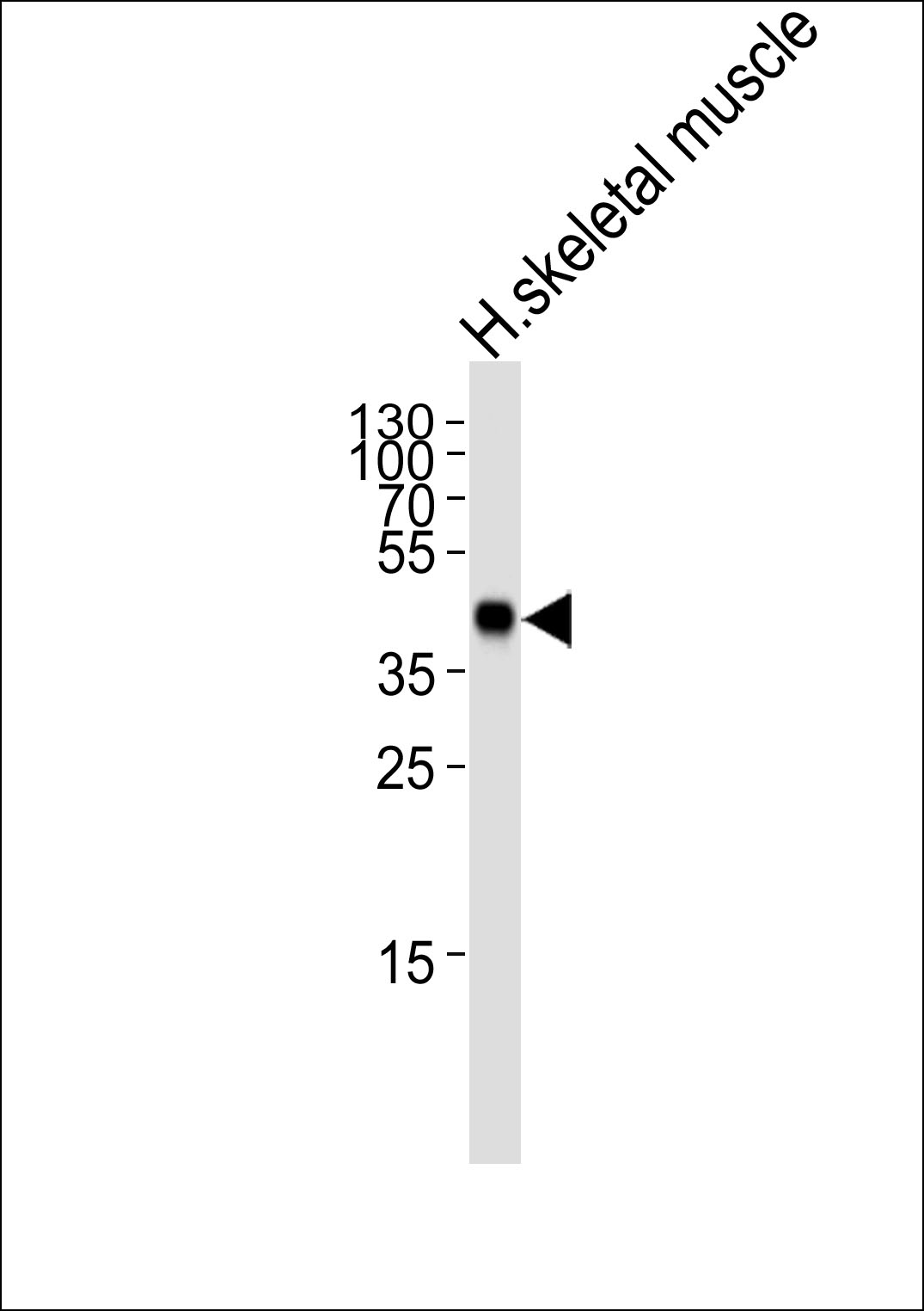 Western blot analysis of lysate from human skeletal muscle tissue lysate,using alpha smooth muscle Actin Antibody(APR05476G). APR05476G was diluted at 1:500. A goat anti-rabbit IgG H&L(HRP) at 1:5000 dilution was used as the secondary antibody.Lysate at 35ug. |
