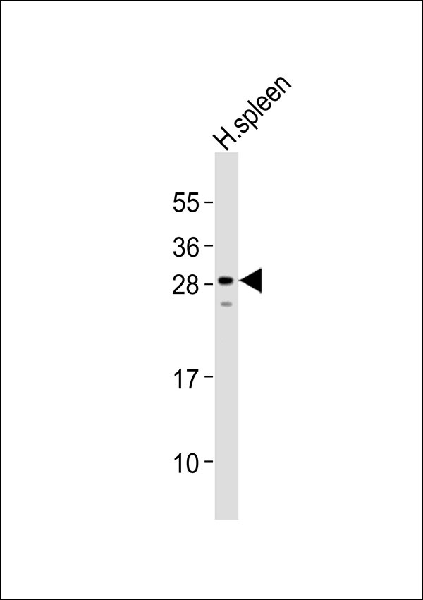 Anti-Carbonic Anhydrase 1 Antibodyat 1:1000 dilution + human spleen lysates Lysates/proteins at 20 μg per lane. Secondary Goat Anti-Rabbit IgG, (H+L),Peroxidase conjugated at 1/10000 dilution Predicted band size : 29 kDa Blocking/Dilution buffer: 5% NFDM/TBST. |