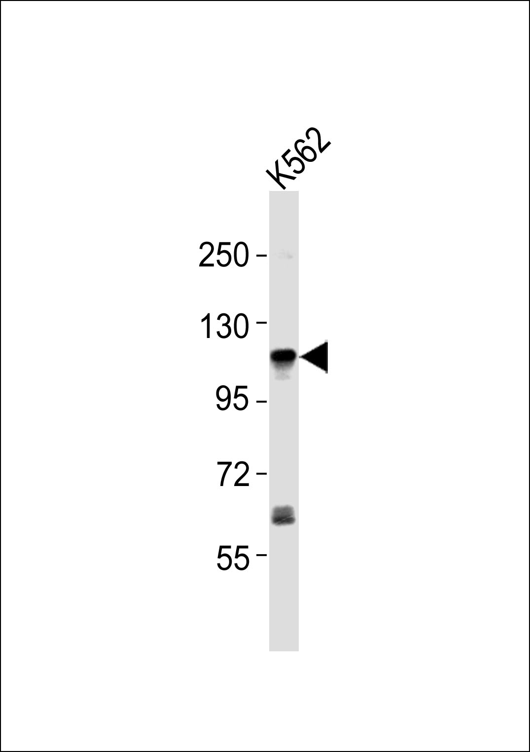 Anti-ERAP1 Antibodyat 1:1000 dilution + K562 whole cell lysates Lysates/proteins at 20 μg per lane. Secondary Goat Anti-Rabbit IgG, (H+L),Peroxidase conjugated at 1/10000 dilution Predicted band size : 107 kDa Blocking/Dilution buffer: 5% NFDM/TBST. |