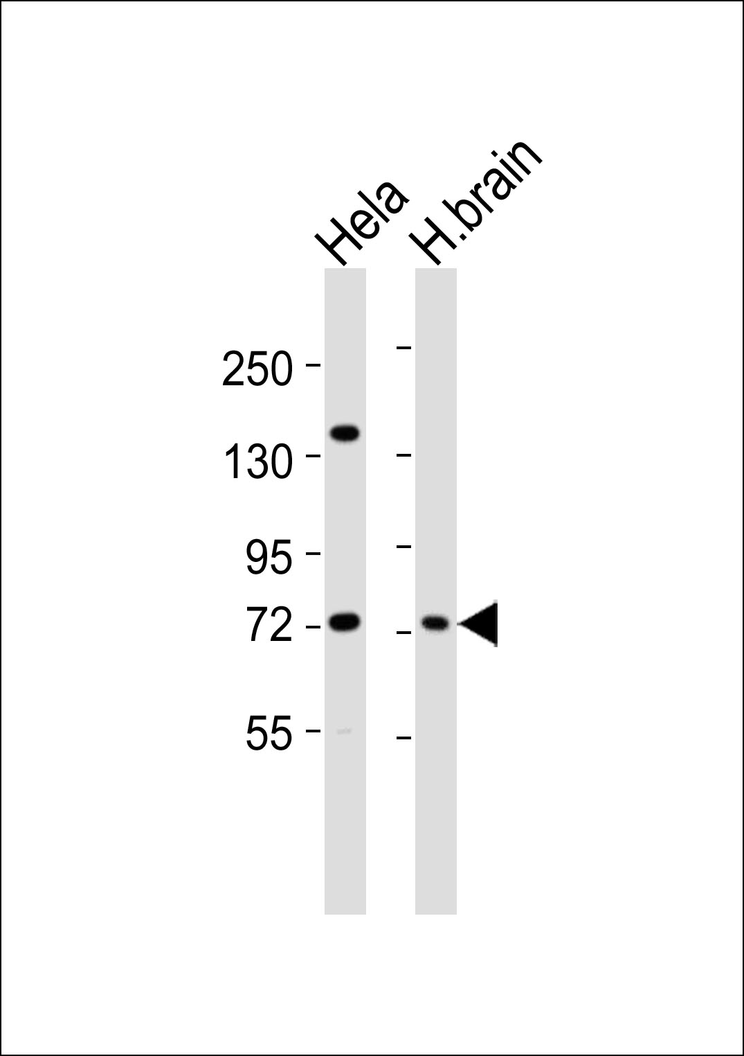 All lanes : Anti-GRK6 Antibody at 1:1000 dilution Lane 1: HeLa whole cell lysates Lane 2: human brain lysates Lysates/proteins at 20 μg per lane. Secondary Goat Anti-Rabbit IgG, (H+L),Peroxidase conjugated at 1/10000 dilution Predicted band size : 66 kDa Blocking/Dilution buffer: 5% NFDM/TBST. |