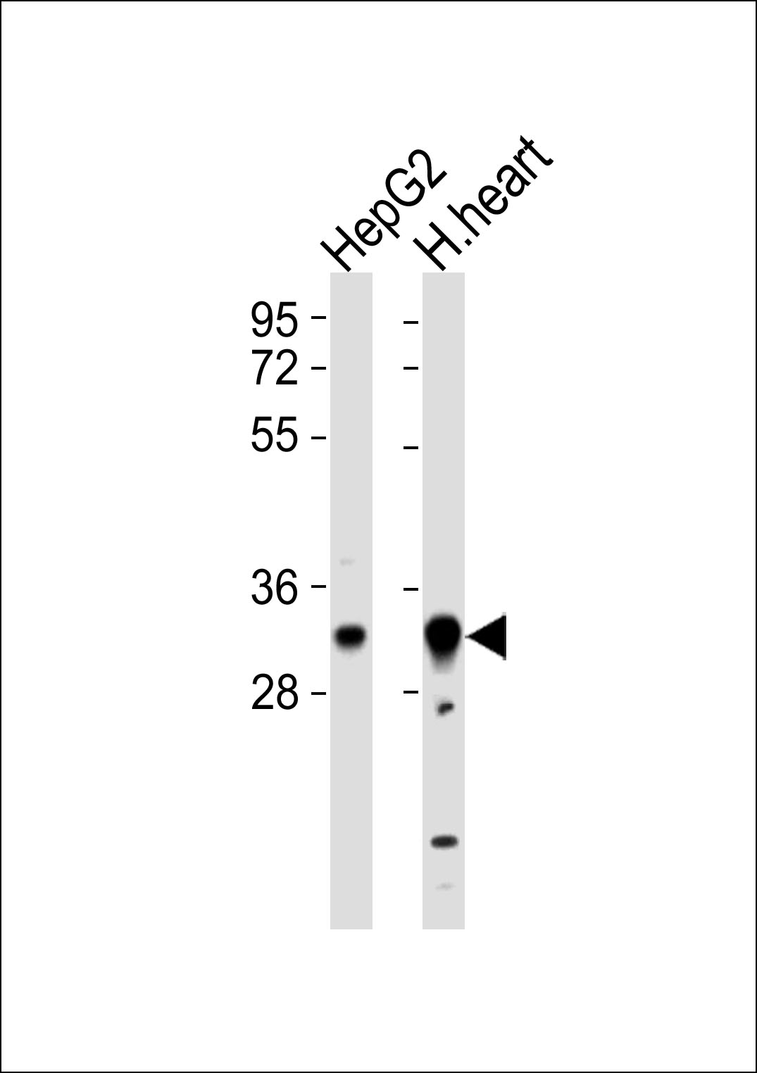 All lanes : Anti-HCCS Antibody at 1:1000 dilution Lane 1: HepG2 whole cell lysates Lane 2: human heart lysates Lysates/proteins at 20 μg per lane. Secondary Goat Anti-Rabbit IgG, (H+L),Peroxidase conjugated at 1/10000 dilution Predicted band size : 31 kDa Blocking/Dilution buffer: 5% NFDM/TBST. |