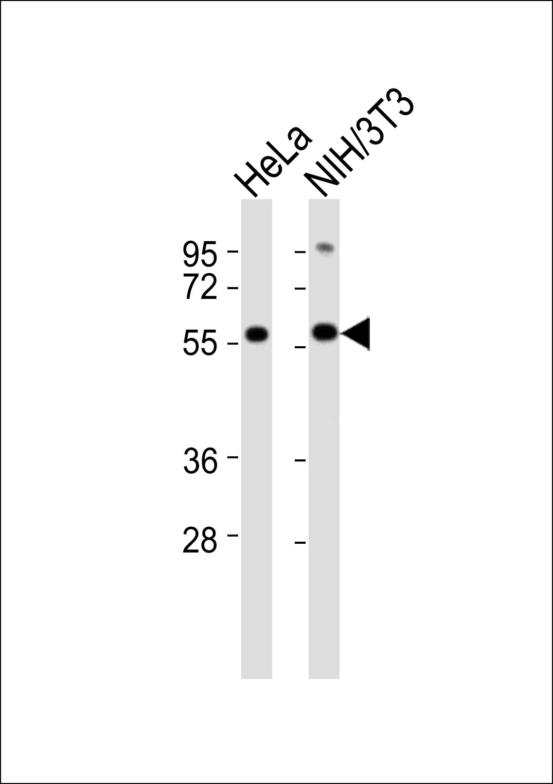 All lanes : Anti-KLF11 Antibody at 1:1000 dilution Lane 1: HeLa whole cell lysates Lane 2: NIH/3T3 whole cell lysates Lysates/proteins at 20 μg per lane. Secondary Goat Anti-Rabbit IgG, (H+L),Peroxidase conjugated at 1/10000 dilution Predicted band size : 55 kDa Blocking/Dilution buffer: 5% NFDM/TBST. |