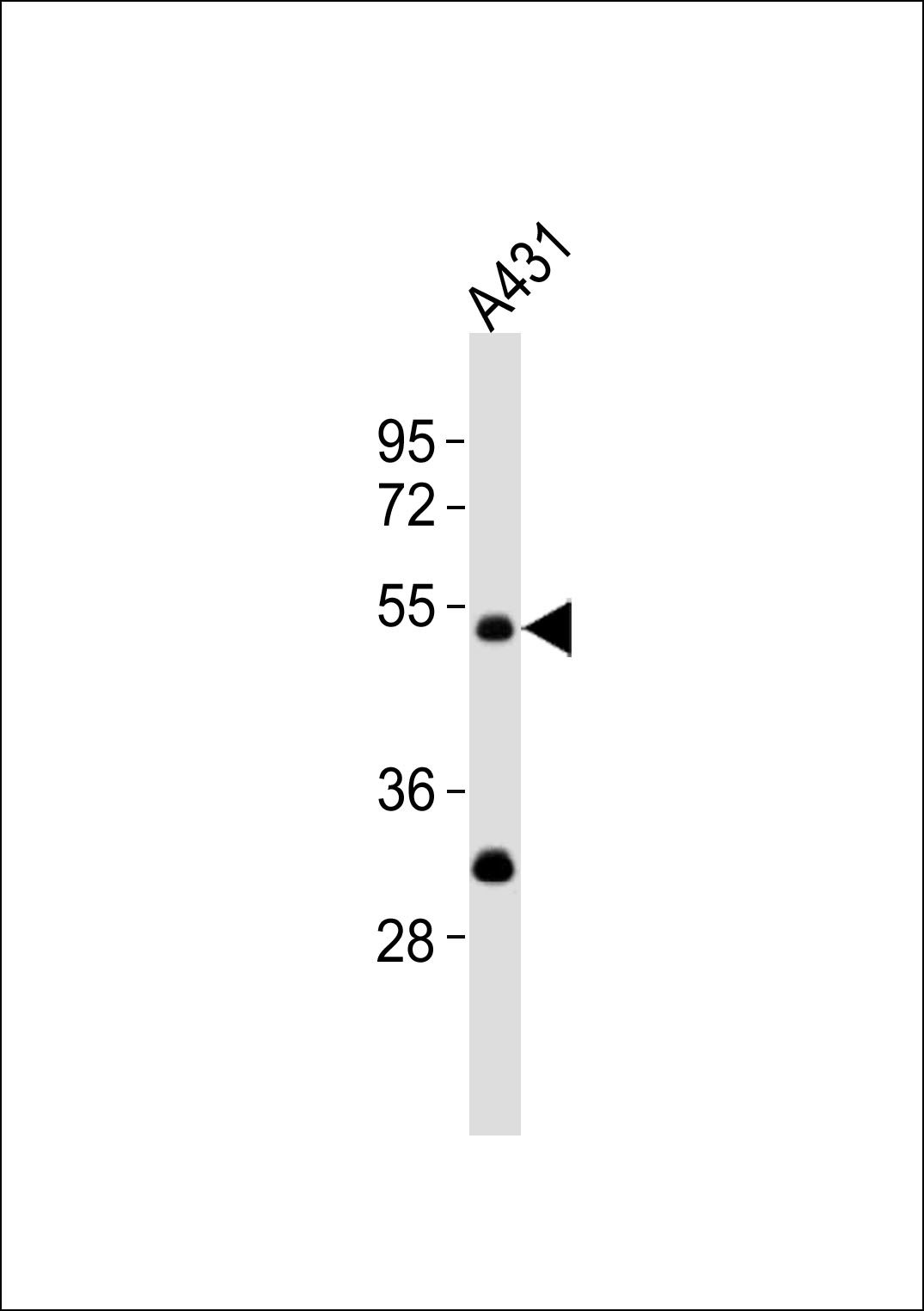Anti-Cytokeratin 13 Antibodyat 1:1000 dilution + A431 whole cell lysates Lysates/proteins at 20 μg per lane. Secondary Goat Anti-Rabbit IgG, (H+L),Peroxidase conjugated at 1/10000 dilution Predicted band size : 50,39,46 kDa Blocking/Dilution buffer: 5% NFDM/TBST. |