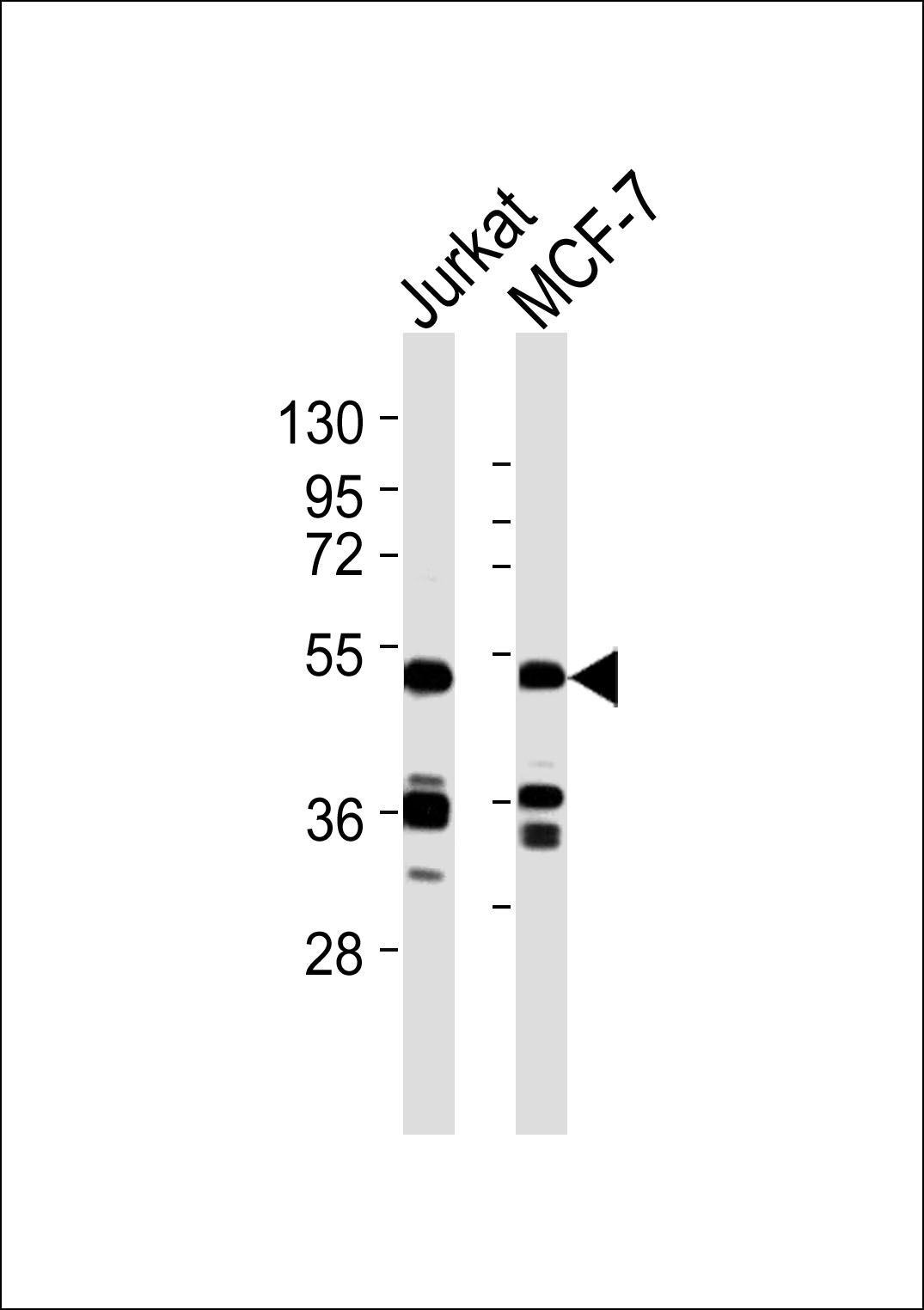 All lanes : Anti-Septin 7 Antibody at 1:1000 dilution Lane 1: Jurkat whole cell lysates Lane 2: MCF-7 whole cell lysates Lysates/proteins at 20 μg per lane. Secondary Goat Anti-Rabbit IgG, (H+L),Peroxidase conjugated at 1/10000 dilution Predicted band size : 51 kDa Blocking/Dilution buffer: 5% NFDM/TBST. |