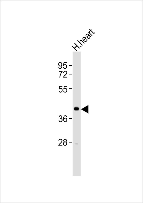 Anti-ZADH2 Antibodyat 1:1000 dilution + human heart lysates Lysates/proteins at 20 μg per lane. Secondary Goat Anti-Rabbit IgG, (H+L),Peroxidase conjugated at 1/10000 dilution Predicted band size : 40 kDa Blocking/Dilution buffer: 5% NFDM/TBST. |