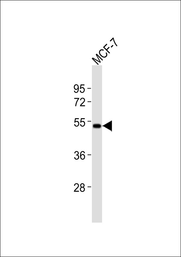 Anti-CD174 Antibodyat 1:1000 dilution + MCF-7 whole cell lysates Lysates/proteins at 20 μg per lane. Secondary Goat Anti-Rabbit IgG, (H+L),Peroxidase conjugated at 1/10000 dilution Predicted band size : 42 kDa Blocking/Dilution buffer: 5% NFDM/TBST. |