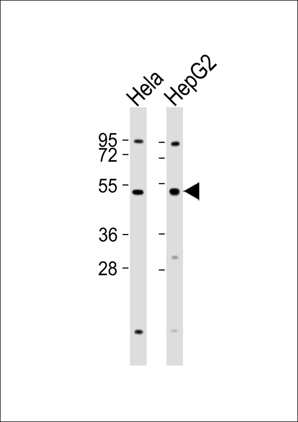 All lanes : Anti-Inhibin beta A Antibody at 1:1000 dilution Lane 1: Hela whole cell lysates Lane 2: HepG2 whole cell lysates Lysates/proteins at 20 μg per lane. Secondary Goat Anti-Rabbit IgG, (H+L),Peroxidase conjugated at 1/10000 dilution Predicted band size : 47 kDa Blocking/Dilution buffer: 5% NFDM/TBST. |