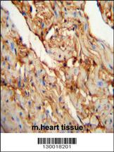 MYOZ1 Antibody (Center) (Cat. APR05602G) immunohistochemistry analysis in formalin fixed and paraffin embedded mouse heart tissue followed by peroxidase conjugation of the secondary antibody and DAB staining. This data demonstrates the use of the MYOZ1 Antibody (Center) for immunohistochemistry. Clinical relevance has not been evaluated.