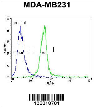 MYOZ1 Antibody (Center) (Cat. APR05602G) flow cytometric analysis of MDA-MB231 cells (right histogram) compared to a negative control cell (left histogram).FITC-conjugated goat-anti-rabbit secondary antibodies were used for the analysis. |