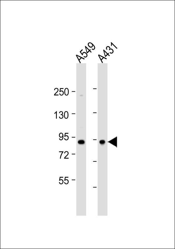 All lanes : Anti-Complement C1S Antibody at 1:1000 dilution Lane 1: A549 whole cell lysate Lane 2: A431 whole cell lysate Lysates/proteins at 20 μg per lane. Secondary Goat Anti-Rabbit IgG, (H+L),Peroxidase conjugated at 1/10000 dilution. Predicted band size : 77 kDa Blocking/Dilution buffer: 5% NFDM/TBST. |