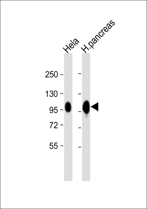 All lanes : Anti-CD276 Antibody at 1:4000 dilution Lane 1: Hela whole cell lysate Lane 2: human pancreas lysate Lysates/proteins at 20 μg per lane. Secondary Goat Anti-Rabbit IgG, (H+L),Peroxidase conjugated at 1/10000 dilution. Predicted band size : 57 kDa Blocking/Dilution buffer: 5% NFDM/TBST. |