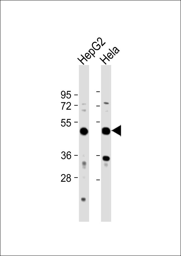 All lanes : Anti-RSAD1 Antibody at 1:1000 dilution Lane 1: HepG2 whole cell lysate Lane 2: Hela whole cell lysate Lysates/proteins at 20 μg per lane. Secondary Goat Anti-Rabbit IgG, (H+L),Peroxidase conjugated at 1/10000 dilution. Predicted band size : 49 kDa Blocking/Dilution buffer: 5% NFDM/TBST. |