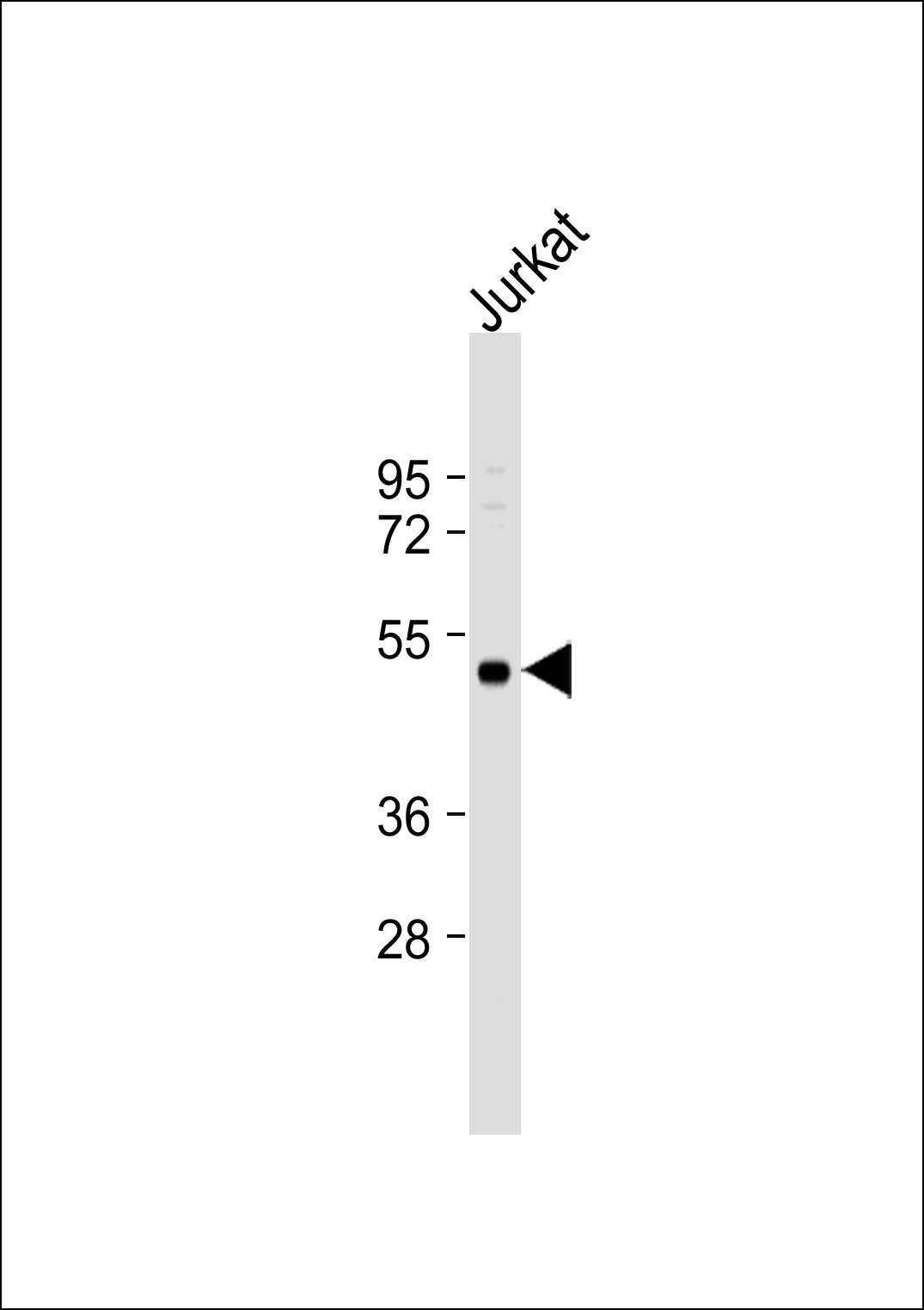 Anti-SH2D2A Antibody at 1:1000 dilution + Jurkat whole cell lysate Lysates/proteins at 20 μg per lane. Secondary Goat Anti-Rabbit IgG, (H+L),Peroxidase conjugated at 1/10000 dilution. Predicted band size : 43 kDa Blocking/Dilution buffer: 5% NFDM/TBST. |