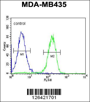 PYHIN1 Antibody (N-term) (Cat. APR05643G) flow cytometric analysis of MDA-MB435 cells (right histogram) compared to a negative control cell (left histogram).FITC-conjugated goat-anti-rabbit secondary antibodies were used for the analysis. |