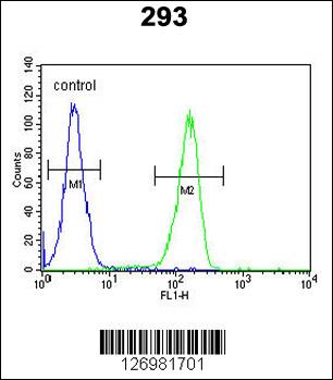KCT2 Antibody (Center) (Cat. APR05659G) flow cytometric analysis of 293 cells (right histogram) compared to a negative control cell (left histogram).FITC-conjugated goat-anti-rabbit secondary antibodies were used for the analysis. |