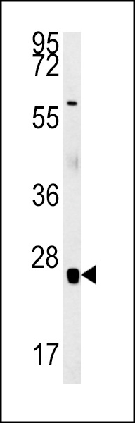 RBM24 Antibody (N-term) (Cat. APR05661G) western blot analysis in mouse heart tissue lysates (15ug/lane).This demonstrates the RBM24 antibody detected RBM24 protein (arrow).