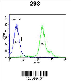 RBM24 Antibody (N-term) (Cat. APR05661G) flow cytometric analysis of 293 cells (right histogram) compared to a negative control cell (left histogram).FITC-conjugated goat-anti-rabbit secondary antibodies were used for the analysis. |