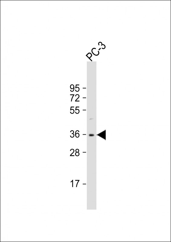 Anti-OTUD6B Antibody (C-term) at 1:1000 dilution + PC-3 whole cell lysate Lysates/proteins at 20 μg per lane. Secondary Goat Anti-Rabbit IgG, (H+L), Peroxidase conjugated at 1/10000 dilution. Predicted band size : 34 kDa Blocking/Dilution buffer: 5% NFDM/TBST.
