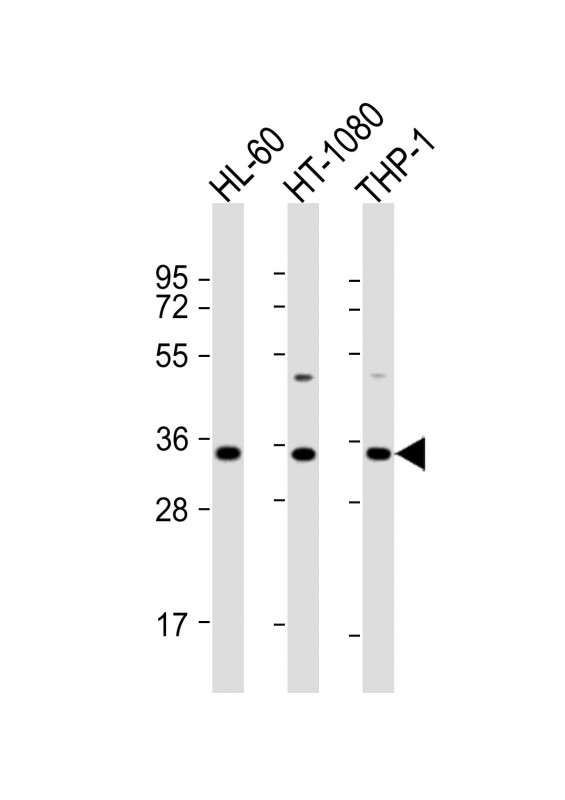 All lanes : Anti-HLA-F Antibody (Center) at 1:2000 dilution Lane 1: HL-60 whole cell lysate Lane 2: HT-1080 whole cell lysate Lane 3: THP-1 whole cell lysate Lysates/proteins at 20 μg per lane. Secondary Goat Anti-Rabbit IgG, (H+L), Peroxidase conjugated at 1/10000 dilution. Predicted band size : 39 kDa Blocking/Dilution buffer: 5% NFDM/TBST.