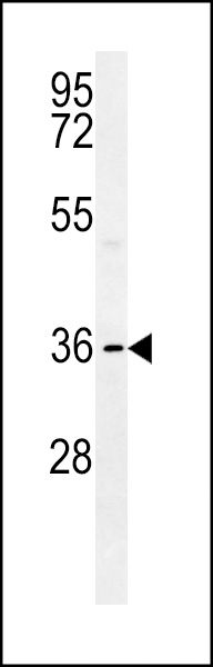 HLA-F Antibody (Center) (Cat. APR05687G) western blot analysis in MDA-MB231 cell line lysates (35ug/lane).This demonstrates the HLA-F antibody detected the HLA-F protein (arrow).