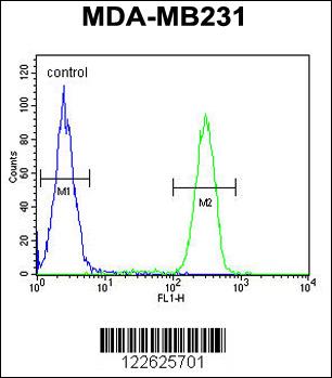 HLA-F Antibody (Center) (Cat. APR05687G) flow cytometric analysis of MDA-MB231 cells (right histogram) compared to a negative control cell (left histogram).FITC-conjugated goat-anti-rabbit secondary antibodies were used for the analysis. |