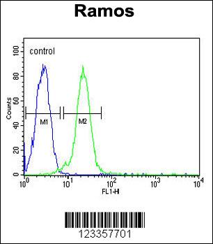 C13orf18 Antibody (Center) (Cat. APR05689G) flow cytometric analysis of Ramos cells (right histogram) compared to a negative control cell (left histogram).FITC-conjugated goat-anti-rabbit secondary antibodies were used for the analysis. |