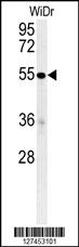 C4BPA Antibody (C-term) (Cat. APR05692G) western blot analysis in WiDr cell line lysates (35ug/lane).This demonstrates the C4BPA antibody detected the C4BPA protein (arrow).