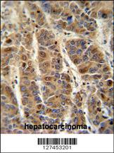 C4BPA antibody (C-term) (Cat. APR05692G) immunohistochemistry analysis in formalin fixed and paraffin embedded human hepatocarcinoma followed by peroxidase conjugation of the secondary antibody and DAB staining. This data demonstrates the use of the C4BPA antibody (C-term) for immunohistochemistry. Clinical relevance has not been evaluated.