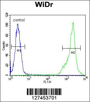 C4BPA Antibody (C-term) (Cat. APR05692G) flow cytometric analysis of WiDr cells (right histogram) compared to a negative control cell (left histogram).FITC-conjugated goat-anti-rabbit secondary antibodies were used for the analysis. |