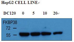 With HepG2 cell line lysate, the resolved proteins were electrophoretically transferred to PVDF membrane and incubated sequentially with primary antibody FKBP38 ( abgent, Cat. AP5990C, 1:1000, 4°C,overnight ) and horseradish peroxidase–conjugated second antibody. After washing, the bound antibody complex was detected using an ECL chemiluminescence reagentand XAR film (Kodak). |